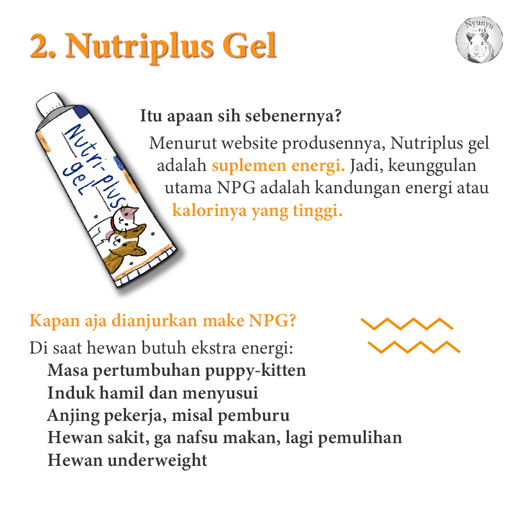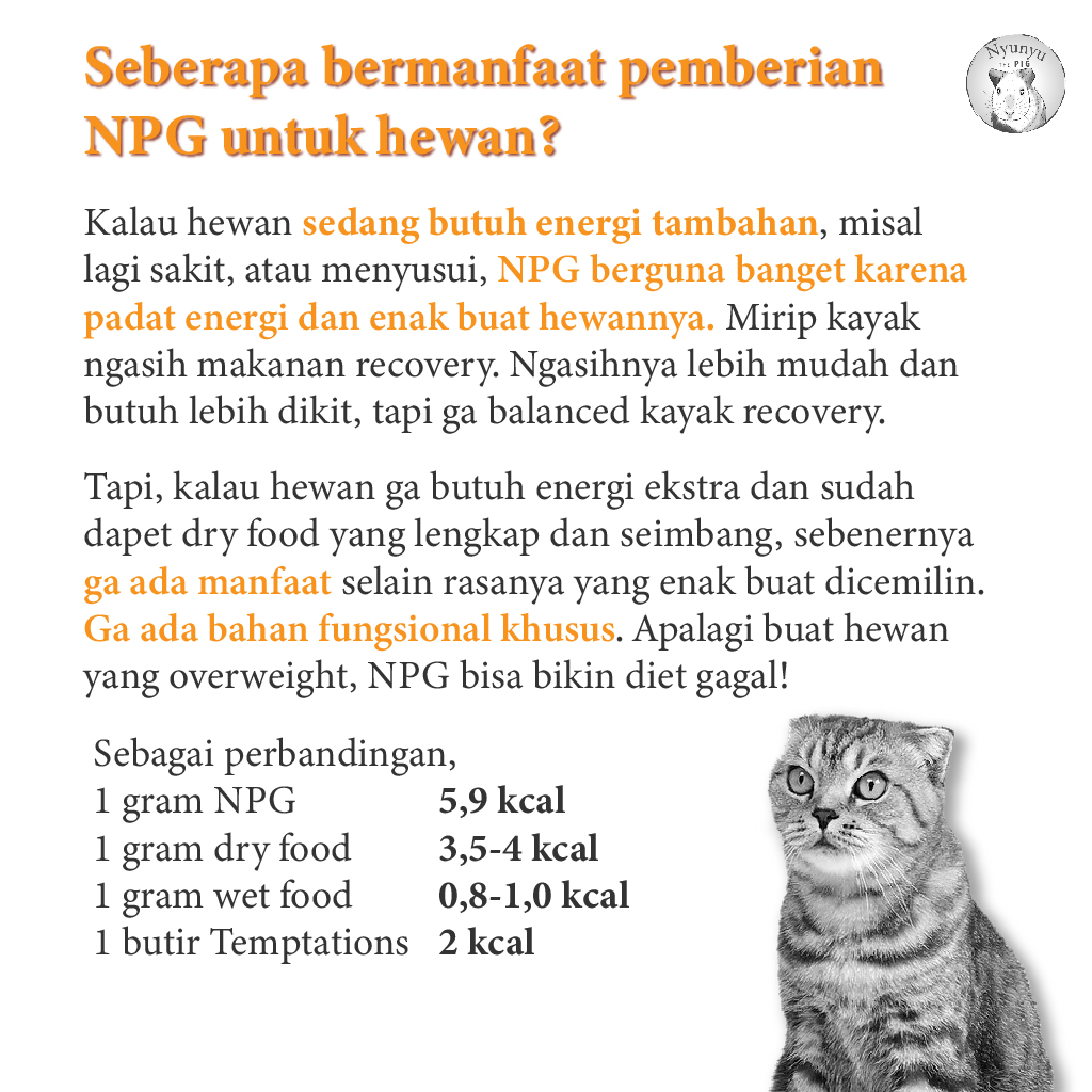 - Hewan sakit dan tidak nafsu makan. Saat sakit, tubuh butuh energi untuk memperbaiki kerusakan, tetapi biasa hewan tidak nafsu makan. NPG dapat diberikan karena energi yang tinggi dan rasa yang disukai hewan.