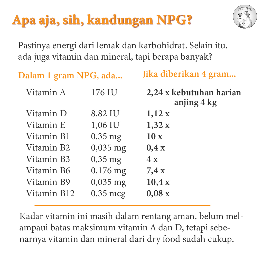 Kandungan utama NPG adalah lemak (35%) dan karbohidrat (49%). Kadar lemak tinggi membuat NPG sangat tinggi energi: 5,9 kcal per gram. Sebagai perbandingan, dry food biasanya mengandung 3,5-4,5 kcal/gram. Protein ada, tetapi sangat sedikit, hanya 1,5%, jadi memang NPG tidak bisa dijadikan satu-satunya sumber makanan. NPG juga dilengkapi beberapa jenis vitamin dan mineral. Kadarnya masih sangat aman dan jauh dari dosis maksimum, tetapi sebenarnya, untuk hewan sehat dan mau makan sendiri, vitamin dan mineral sudah didapatkan dari dry food.
