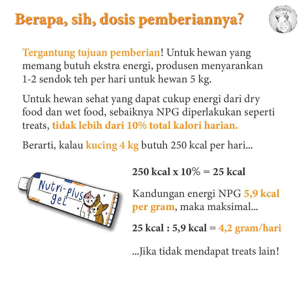Ini tergantung tujuan pemberiannya, tetapi Virbac sendiri menyarankan 1-2 sendok teh per hari untuk hewan seberat 5 kg yang membutuhkan. Hewan sehat sebenarnya tidak butuh NPG, tetapi boleh saja jika pemilik ingin memberi NPG sebagai treat. Treat sebaiknya tidak melebihi 10% kebutuhan kalori harian. Untuk kucing seberat 5 kg dengan kebutuhan 250 kcal per hari, 10% kalori berarti 25 kcal, setara dengan 4 gram NPG per hari. Bingung berapa kebutuhan kalori peliharaanmu? Klik di sini.