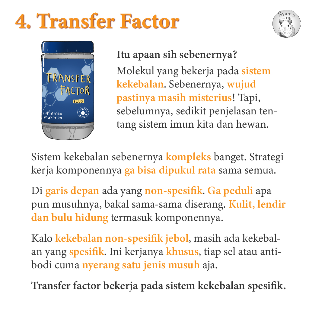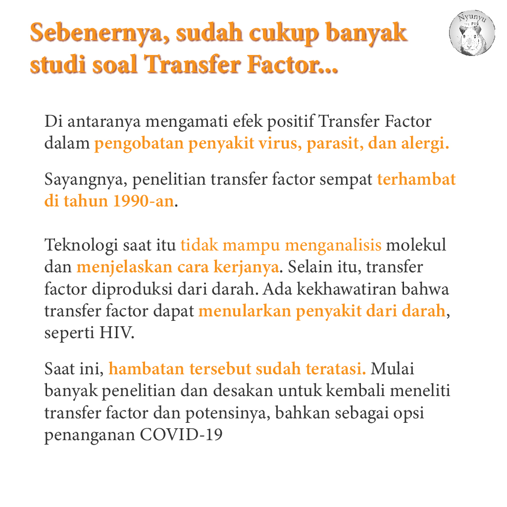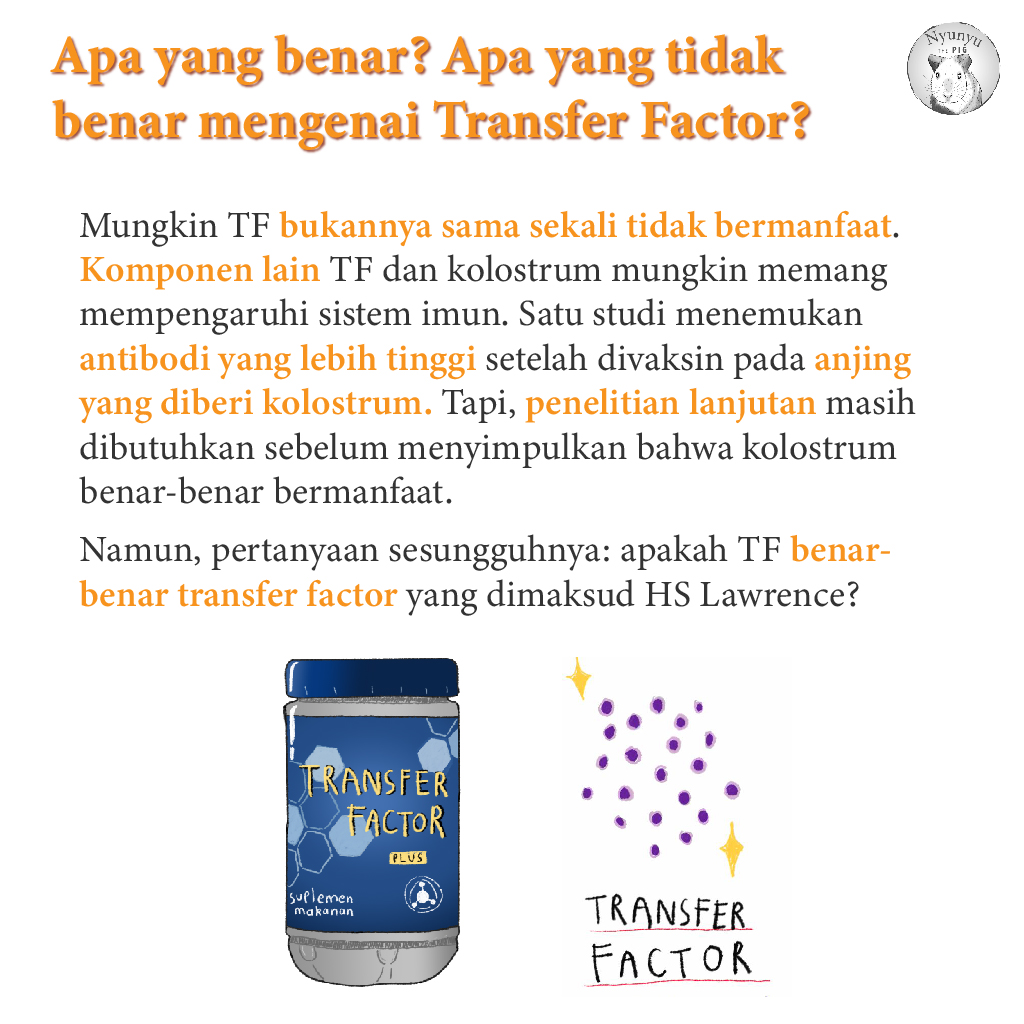 Sulit juga untuk bilang produk MLM Transfer Factor tidak berguna sama sekali, dan mungkin memang kandungan produk tersebut bisa memengaruhi kerja sistem imun. Misalnya, kolostrum memang mengandung beberapa komponen bioaktif dan dilaporkan bisa meningkatkan respon imun anjing terhadap vaksin (16). Namun, satu yang pasti: produk yang mendomplang nama Transfer Factor ini tidak sama sama dengan transfer factor dari sel T darah yang ditemukan oleh Dr HS Lawrence, dan sampai sekarang, tidak ada bukti kalau suplemen tersebut benar-benar efektif Kalau mau beli kolostrum saja sih, banyak merk lain yang lebih murah.