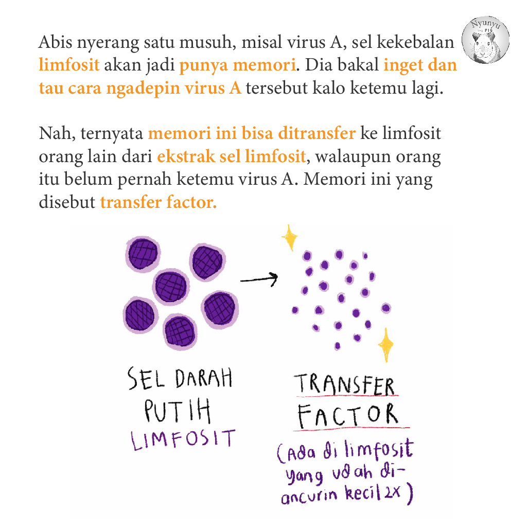 Memori kekebalan ini hanya ada pada tubuh orang yang sudah pernah bertemu virus tersebut. Namun, tahun 1949, seorang dokter bernama H. Sherwood Lawrence membuktikan bahwa memori kekebalan ditransfer ke orang lain. Bahkan, sel tersebut tidak perlu berbentuk utuh dan dan masih hidup. Sel yang sudah pecah menjadi molekul kecil juga bisa (1). Dengan demikian, orang yang belum pernah bertemu musuh bisa mendapat memori dari sel imun orang lain. Molekul yang bisa mentransfer kekebalan inilah yang disebut transfer factor.