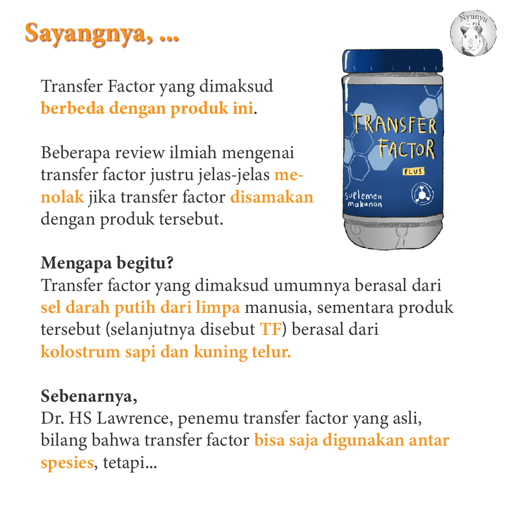 Sayangnya, kerja produk Transfer Factor tidak begitu. Satu produk Transfer Factor dari kolostrum dan kuning telur diberikan untuk semua jenis penyakit, padahal penyakit sapi dan ayam berbeda dengan penyakit manusia dan kucing. Sangat kecil kemungkinan sel T mereka punya memori penyakit manusia dan kucing.