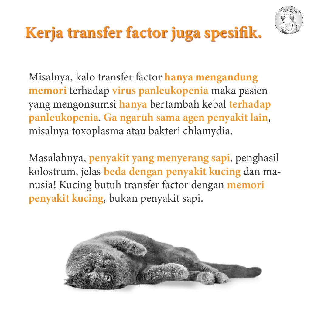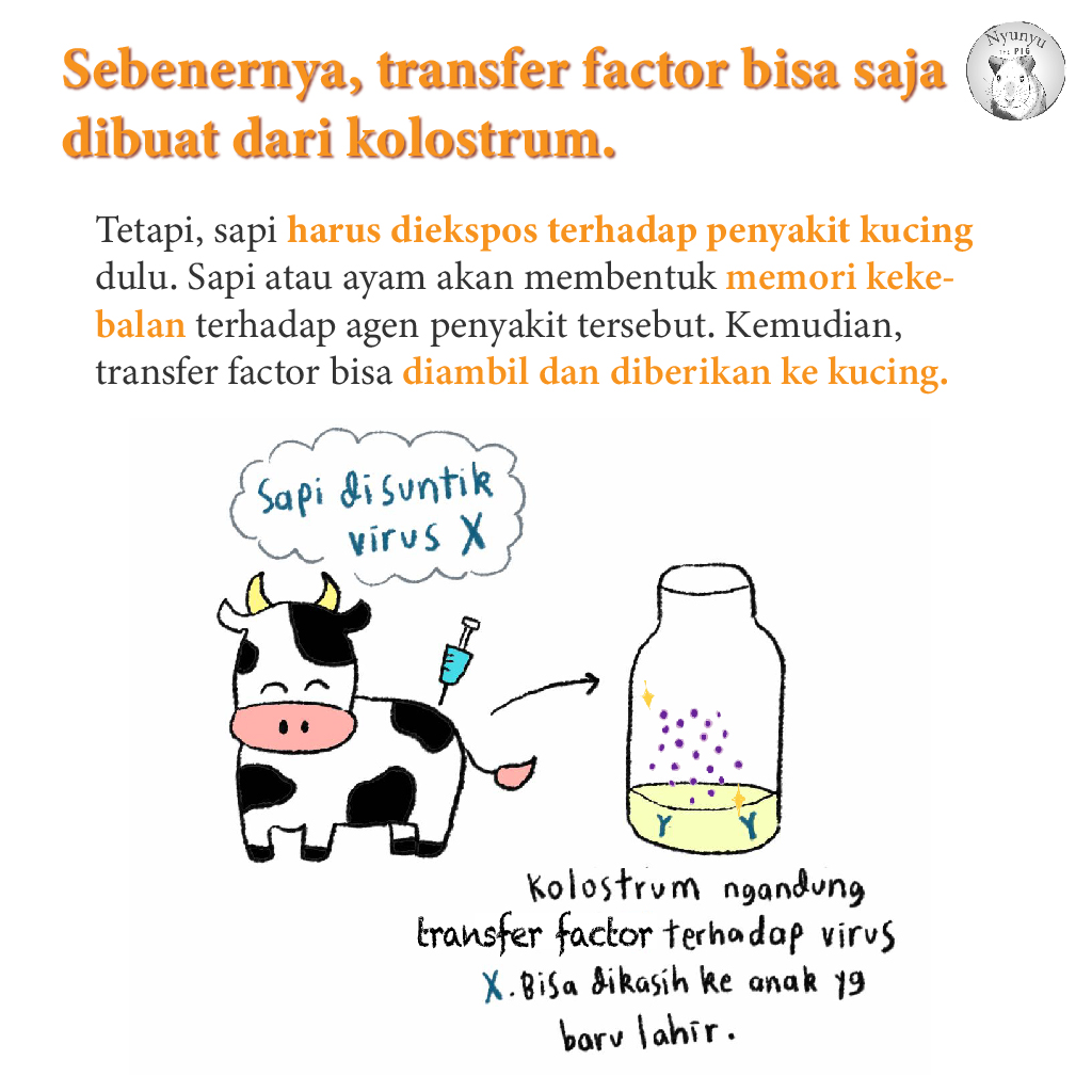 Apakah mungkin membuat transfer factor untuk kucing dari kolostrum dan kuning telur? Mungkin saja. Caranya, sapi atau ayam tersebut harus diimunisasi dengan penyakit tertentu yang mau dibuat transfer factornya. Misalnya, untuk membuat transfer factor panleukopenia, sapi harus disuntik panleukopenia dulu, lalu setelah kekebalan terbentuk, baru diambil transfer factor dari kolostrumnya. Mudah untuk bicara teori seperti ini, tetapi kenyataannya, saya juga tidak yakin bisa.