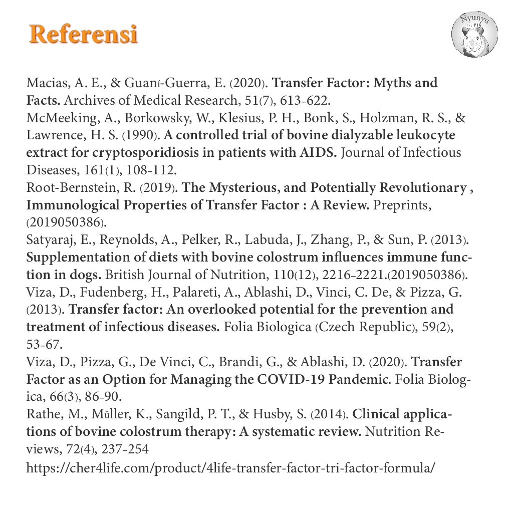 Selanjutnya, post ini akan fokus pada produk Transfer Factor dari kolostrum dan kuning telur yang sering digunakan di kucing. Untuk memudahkan, istilah produk Transfer Factor (dengan huruf kapital) saya gunakan untuk mengacu pada produk tersebut, sementara transfer factor asli dari darah akan saya tulis dengan huruf kecil atau saya sebut DLE (dialyzable leukocyte extract).
