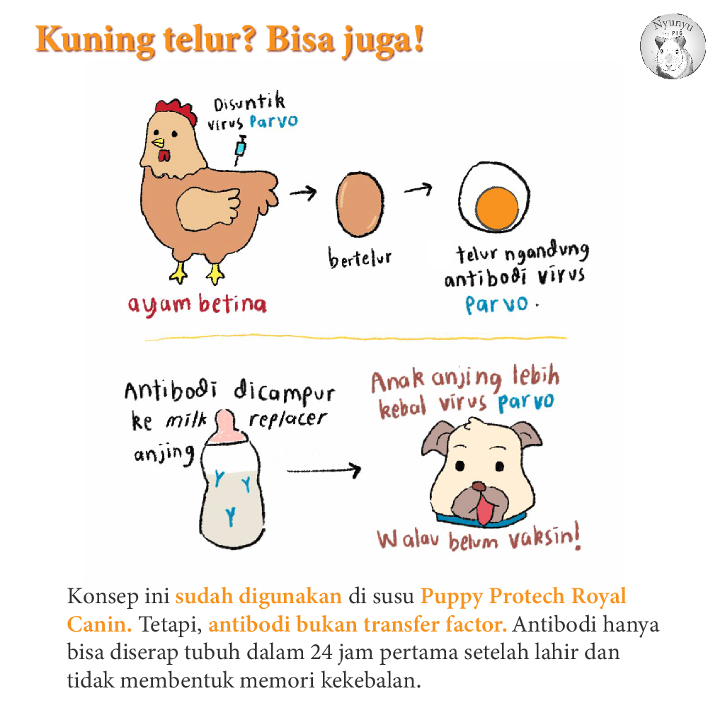 Cara ini sudah dimanfaatkan oleh Royal Canin dalam membuat pengganti susu anjing dengan antibodi terhadap parvovirus menggunakan kuning telur (Puppy ProTech). Parvovirus anjing disuntikkan kepada ayam petelur, lalu kuning telur yang mengandung antibodi terhadap parvovirus digunakan untuk membuat susu. Walaupun sama-sama spesifik, antibodi berbeda dengan sel T atau transfer factor. Antibodi tidak punya memori, jadi dalam beberapa minggu juga akan hilang. Selain itu, transfer antibodi adalah proses alami induk ke anak melalui kolostrum, berbeda dengan transfer factor yang merupakan hal baru