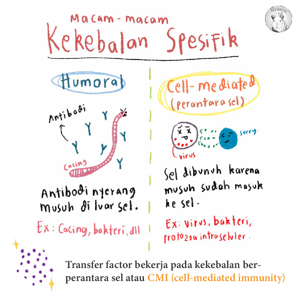 Sementara itu, sistem imun spesifik bekerja sesuai dengan musuh yang dihadapi. Beda musuh, beda juga cara menyerangnya. Karena itu, kerja sistem imun spesifik lebih efisien dan efektif, tetapi butuh waktu lebih untuk mengenali dan membentuk pasukan penyerang musuh. Ada dua jenis sistem imun spesifik: humoral (antibodi), dan berperantara sel. Transfer Factor mengklaim bekerja melalui sistem imun berperantara sel. Biar lebih jelas, silakan baca slideshow di bawah.